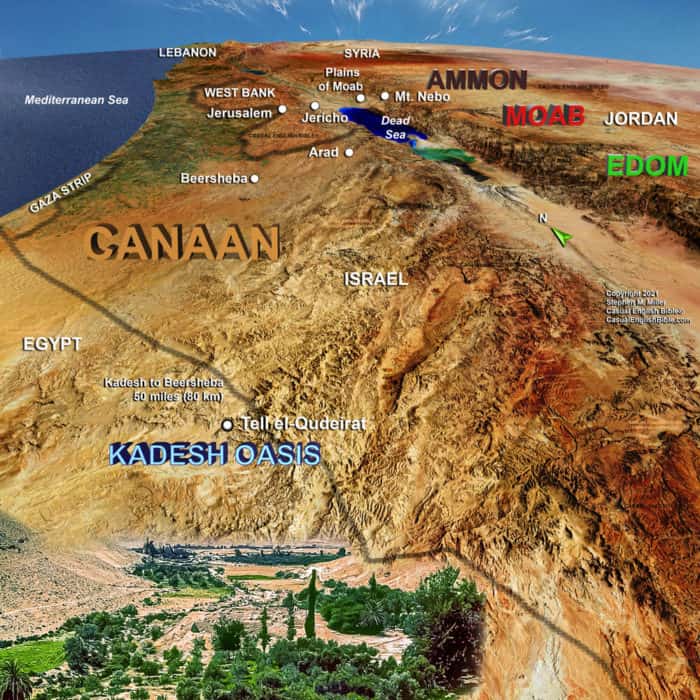 Bible Book: Numbers, Deuteronomy, Judges Type: Maps Location: Arad, Arnon River, Canaan, Dead Sea, Egypt, Gaza Strip, Israel, Jericho, Jordan River, Kadesh Oasis, Midian, Moab, Mount Hor, Mount Nebo, Oboth, Petra, Punon, Qadeis Spring, Seir hills, Zin Desert Era: Conquering Canaan